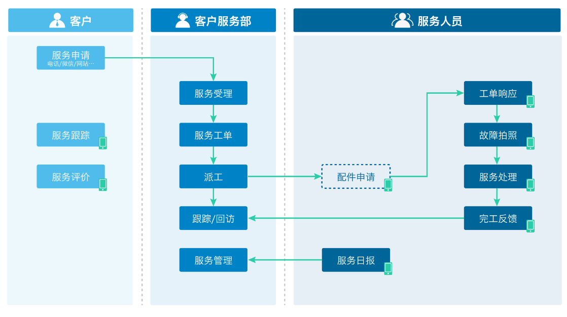 管理人員再也不用通過電話或微信詢問服務(wù)情況了,可以通過電腦、手機(jī)端實(shí)時(shí)掌控客戶服務(wù)進(jìn)展、售后管理如此輕松。