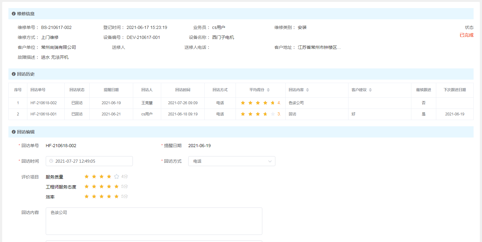 系統(tǒng)自動(dòng)生成工單回訪提醒,對(duì)維修情況進(jìn)行跟蹤回訪。