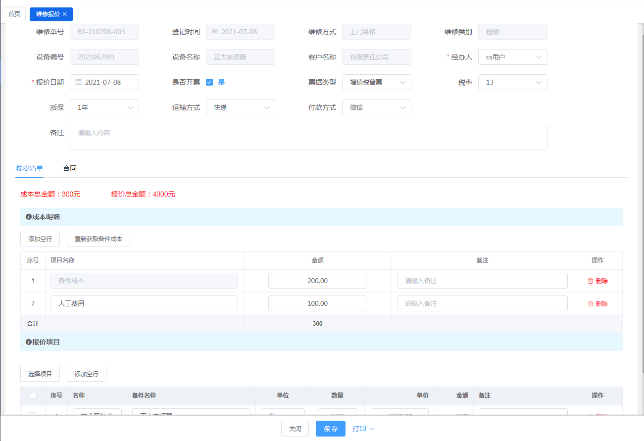 可根據業務情況進行靈活報價,支持運費、招待費等附加費用錄入,便于準確統計工單成本。 支持打印多種報價單格式,靈活滿足不同單位客戶需求。