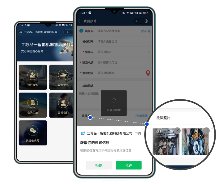 微信小程序掃碼報修,主動定位,上傳故障照片、視頻,維修工單一鍵生成,體驗流暢